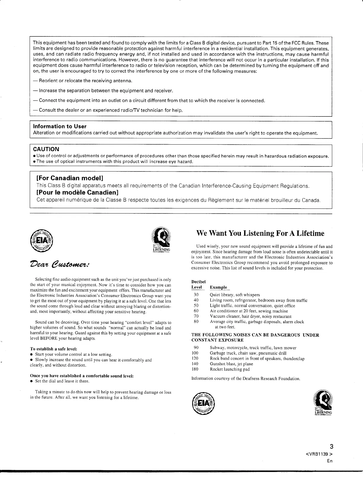 excessive noise. This list of sound levels is included for your protection.