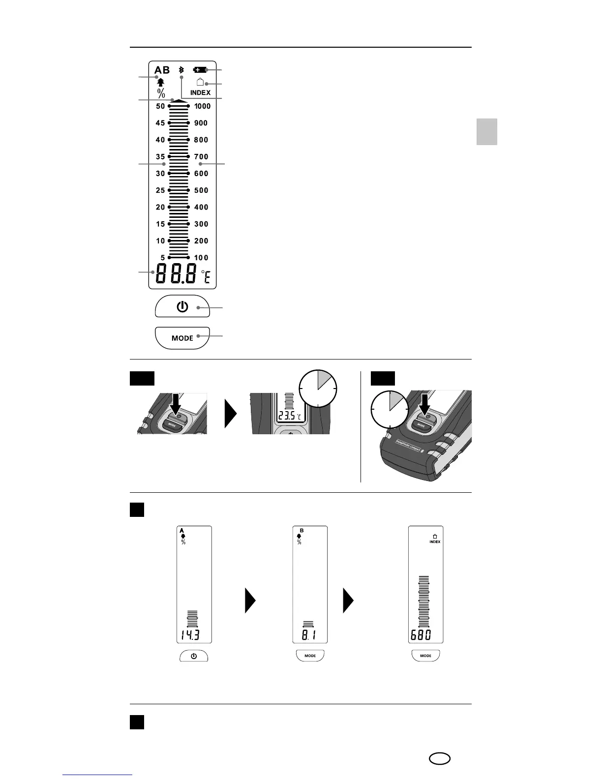 Het apparaat start met de als laatste ingestelde meetmodus.