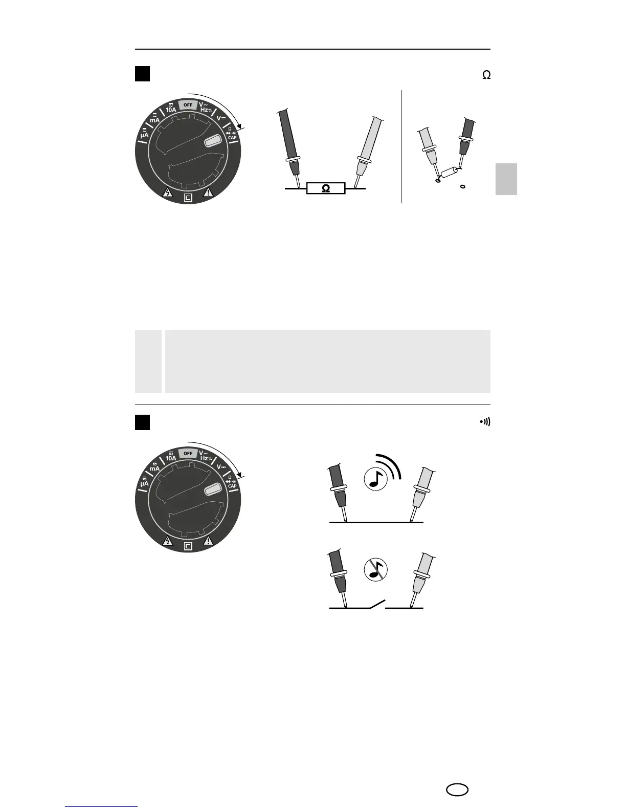 Til gennemgangstest stiller man drejekontakten i pos. „Ω“, og