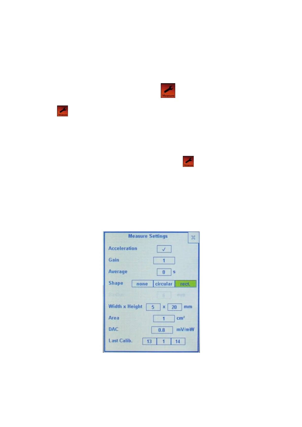 the “Measure settings” windows allowing the view and setting of the above parameters; this window allows also