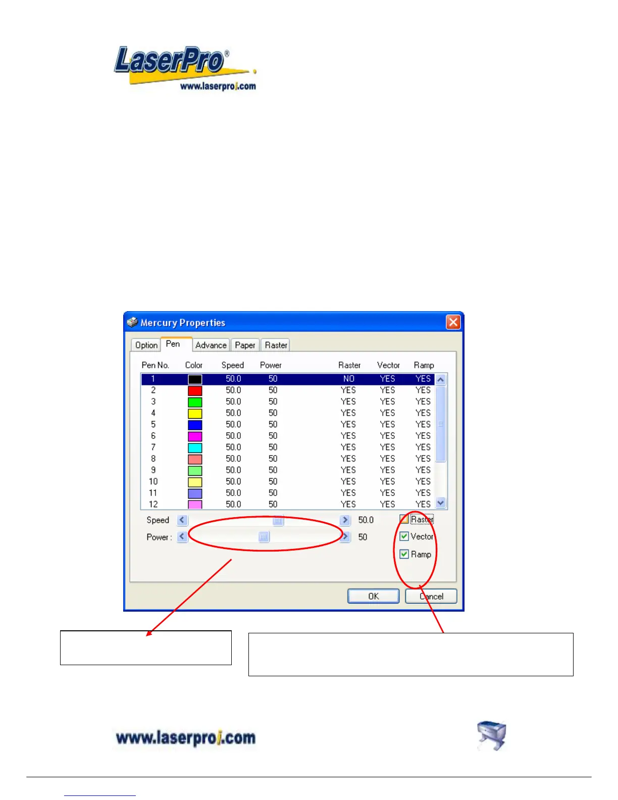 Check to enable or disable raster / vector / power ramp for each pen