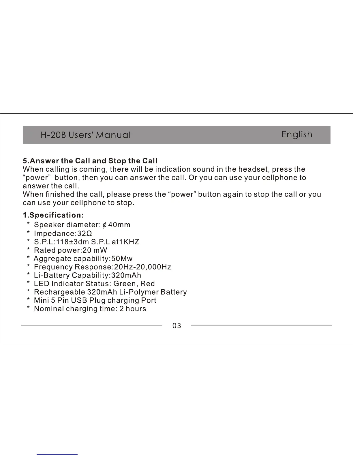 lasmex H-20B - Answering and Ending Calls; Specifications