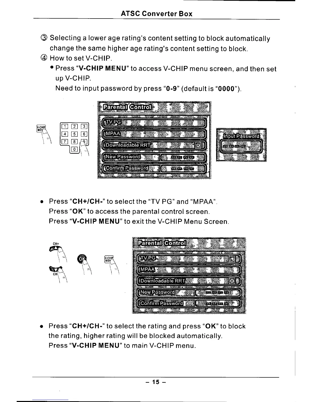 • Press "CH+/CH." to select the "TV PG" and "MPAA".