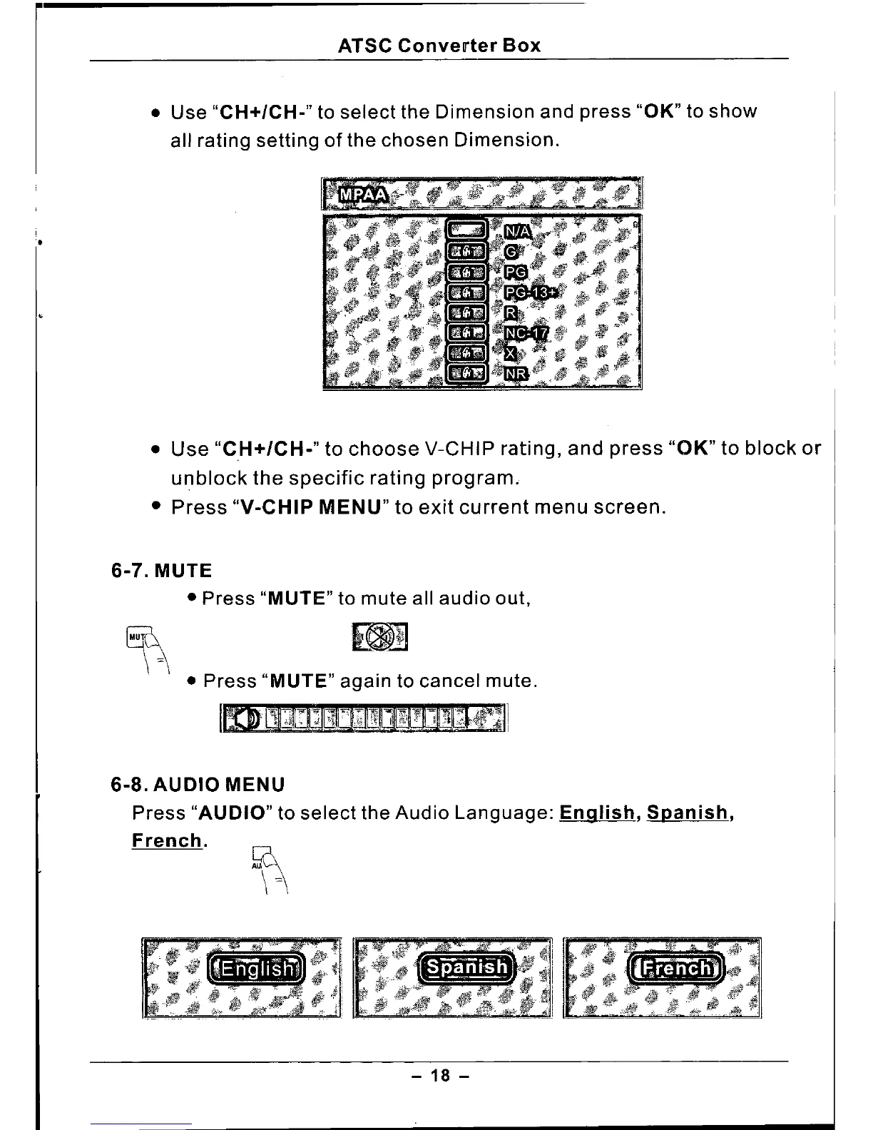 Press "AUDIO" to select the Audio Language: English, Spanish,
