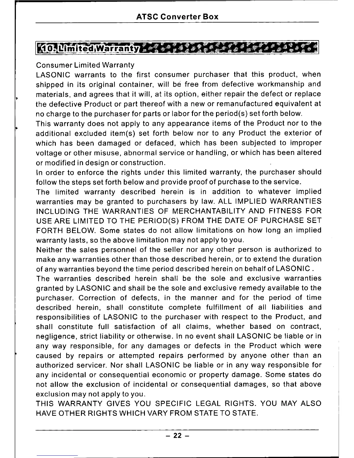 LASONIC warrants to the first consumer purchaser that this product, when