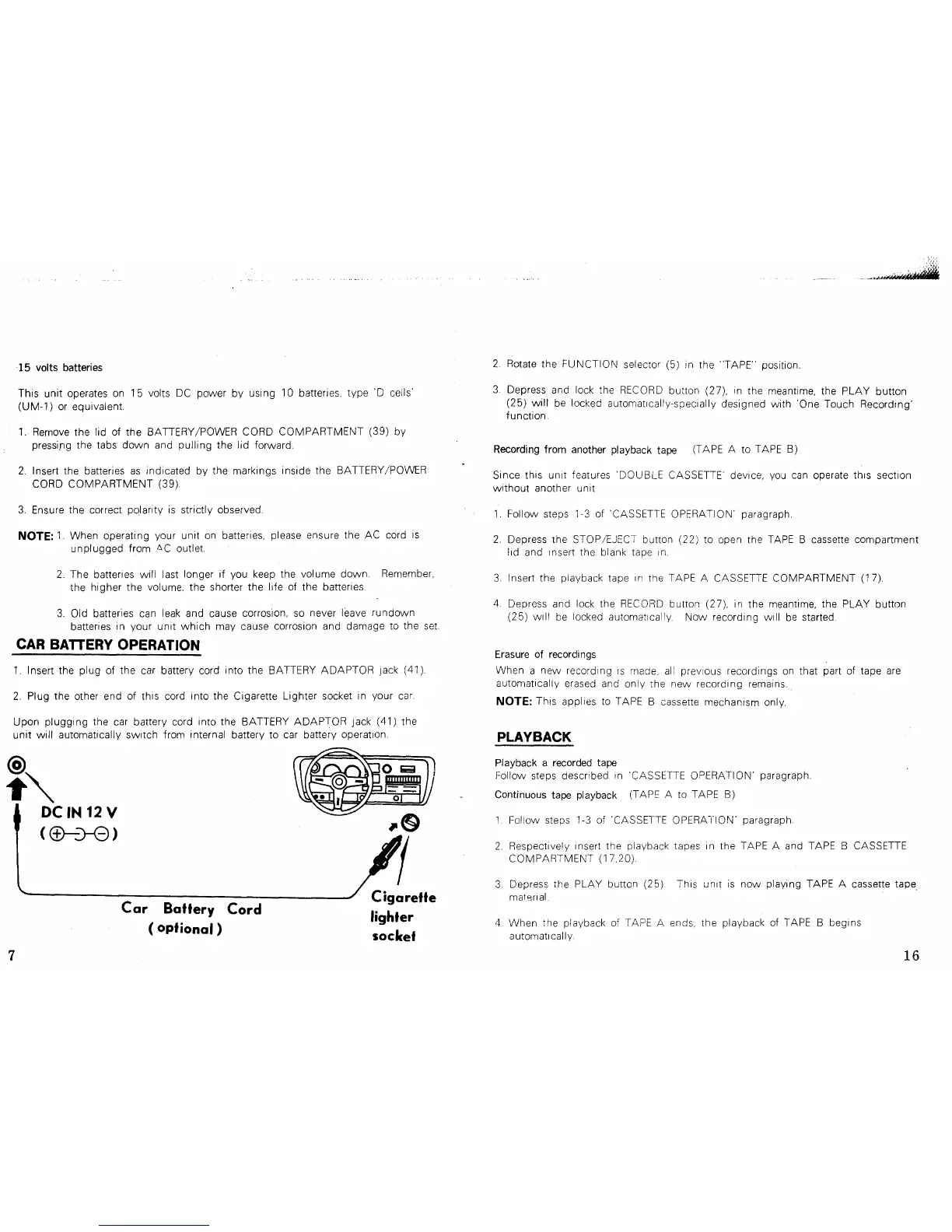 Lasonic TRC-931 - Battery and Cassette Operations; Battery Usage and Charging; Double Cassette Functionality