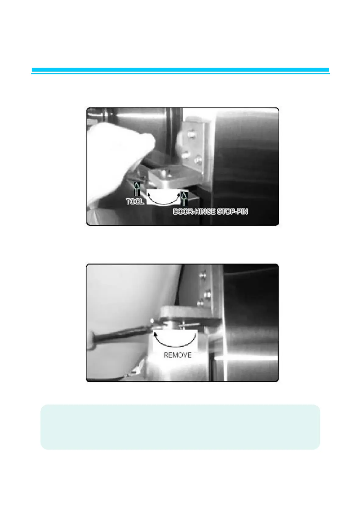 D. Place the door hinge stop pin and adjust the strength of the door spring.