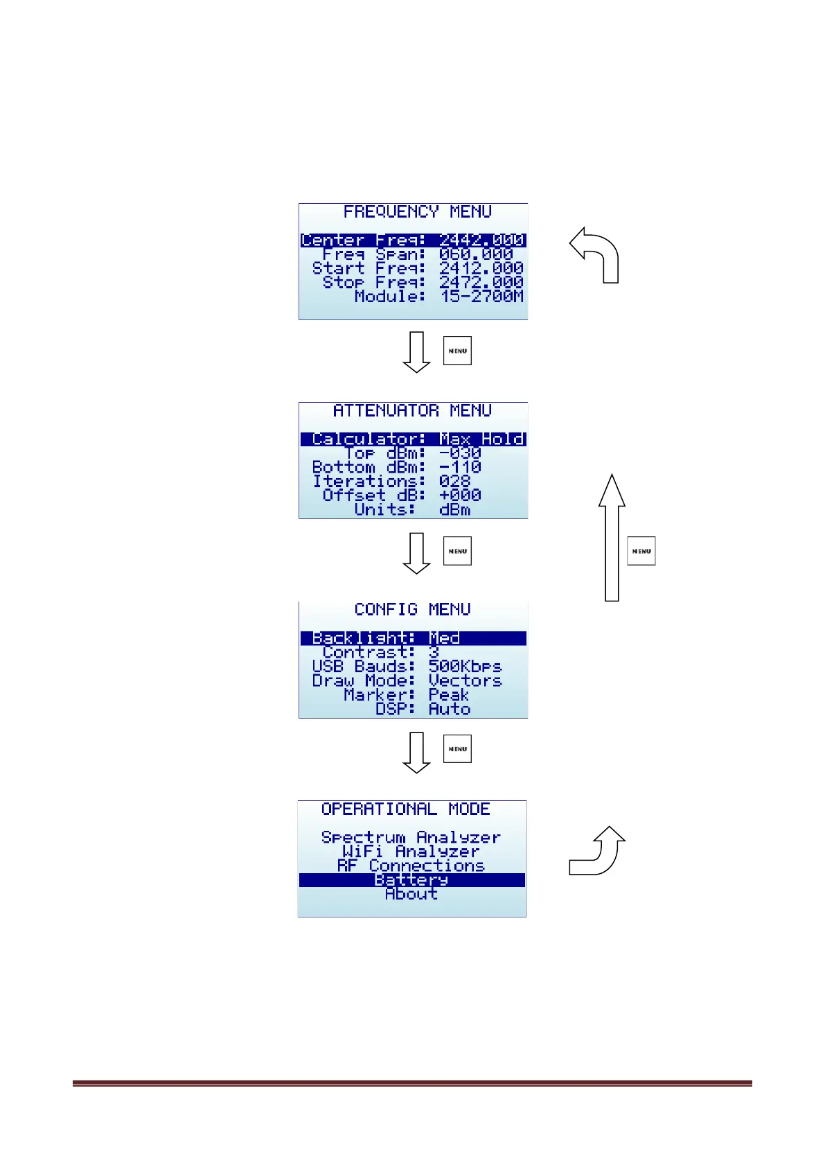 There are several menus in RF Explorer. They are organized on different screens, which you can iterate