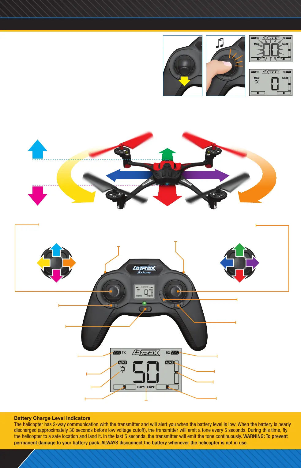 the helicopter to a safe location and land it. In the last 5 seconds, the transmitter will emit the tone continuously. WARNING: To prevent