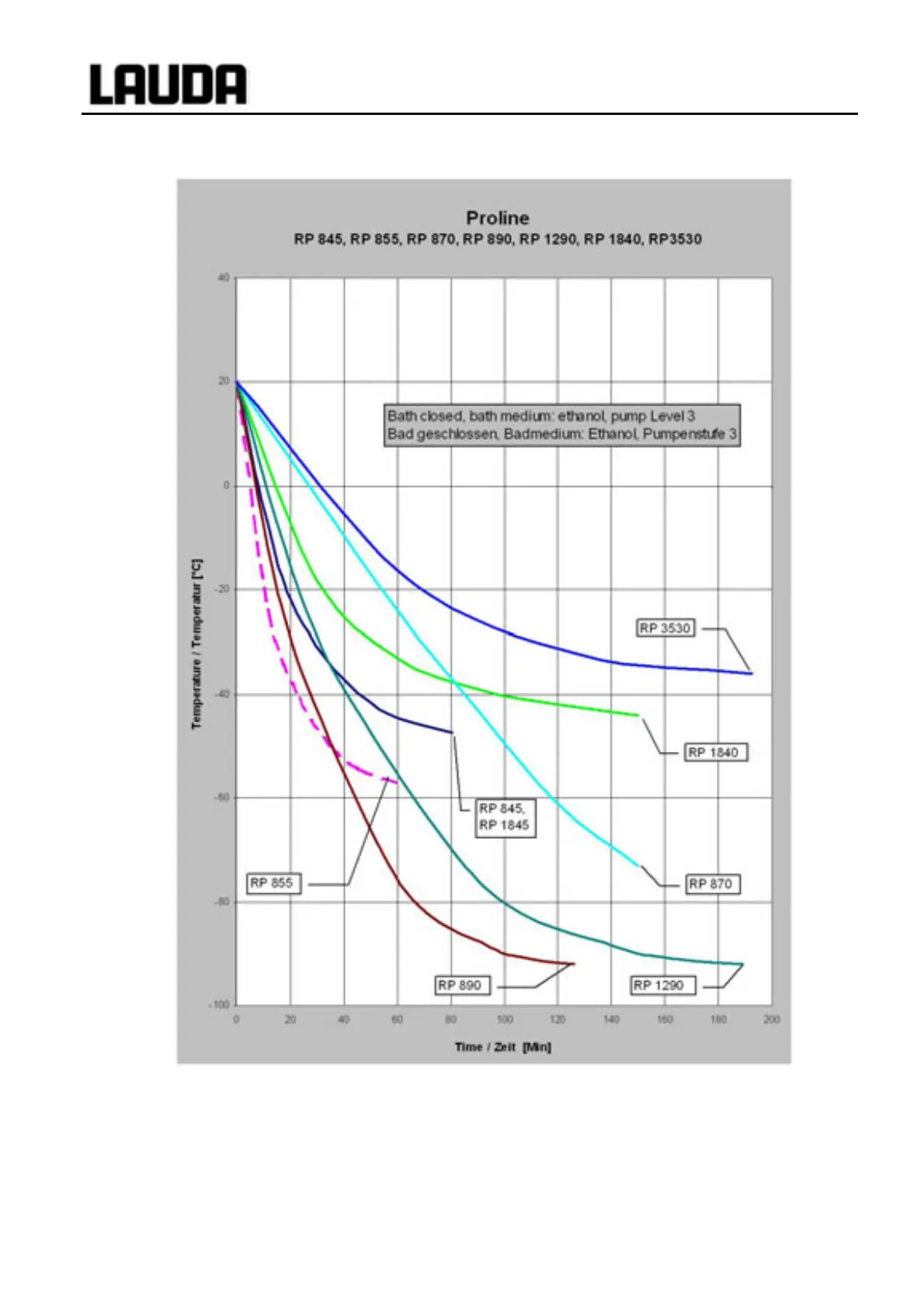Cooling curves; Bath closed, heat carrier liquid ethanol, Pump Level 3; Time in minutes; Temperature in °C