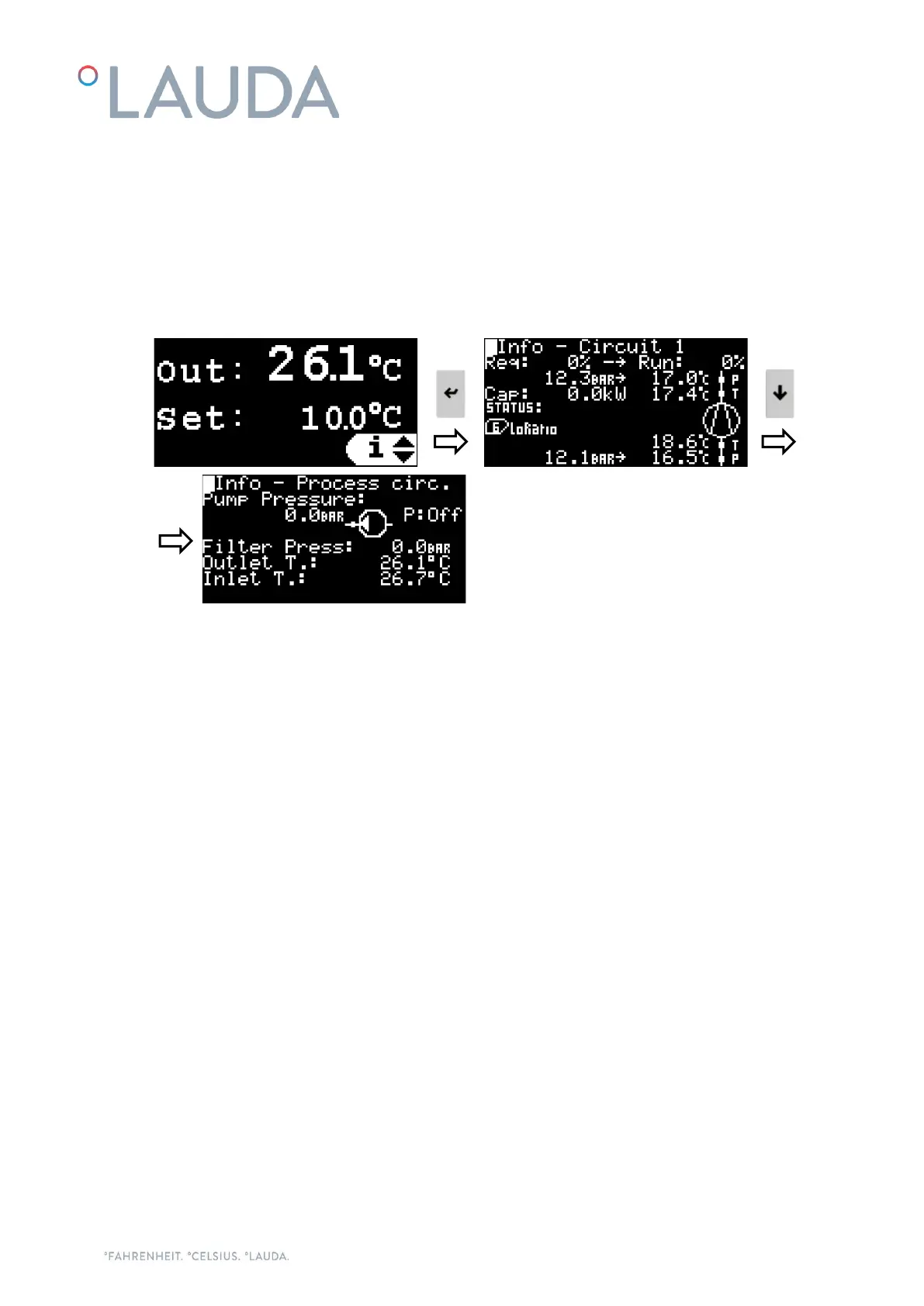 number. Use the Up/Down buttons to navigate the different screens. Information on the pump pressure and