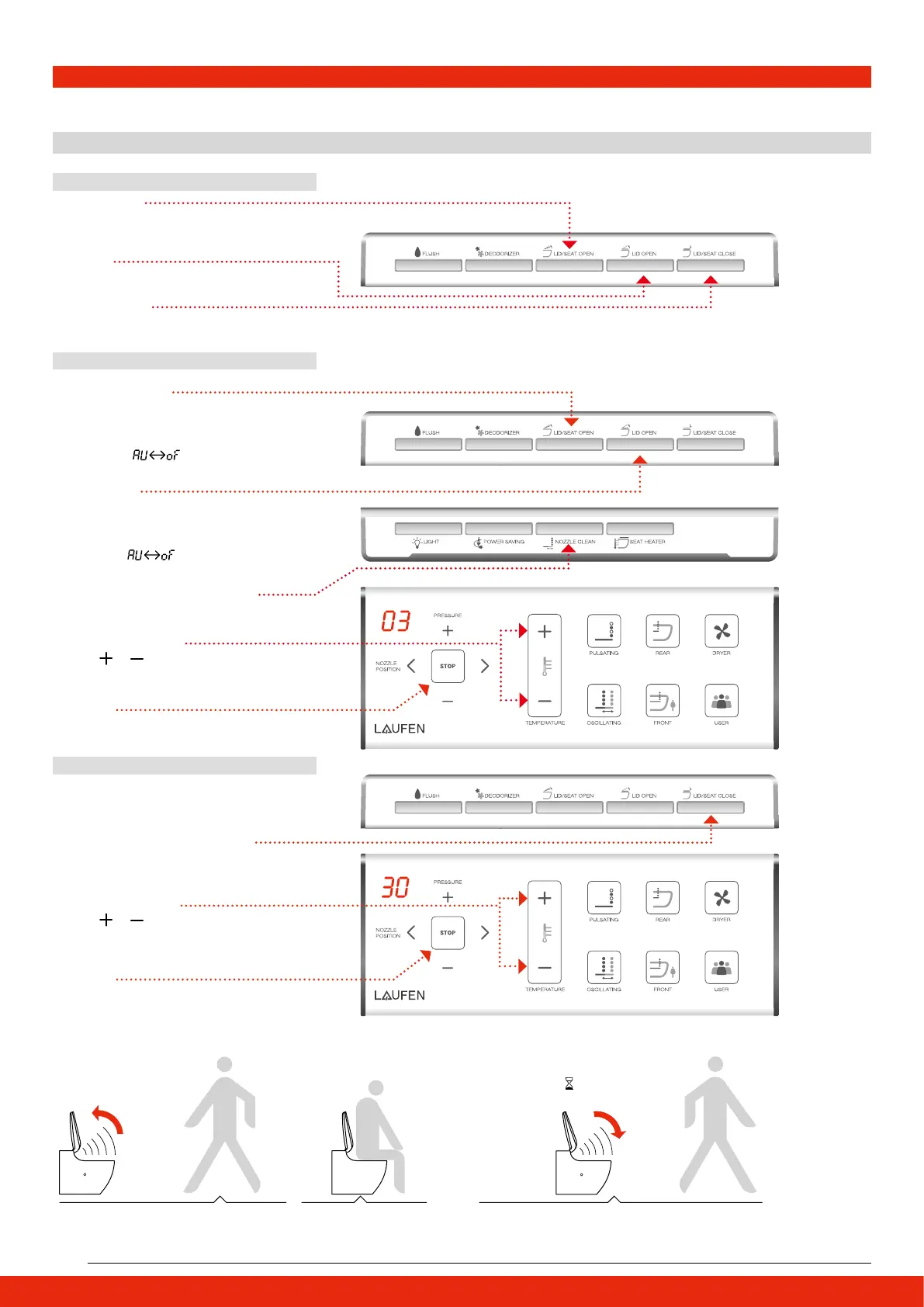 2. After closing the lid or seat by hand or remote control, lid auto open can only be activated again after 10 seconds.