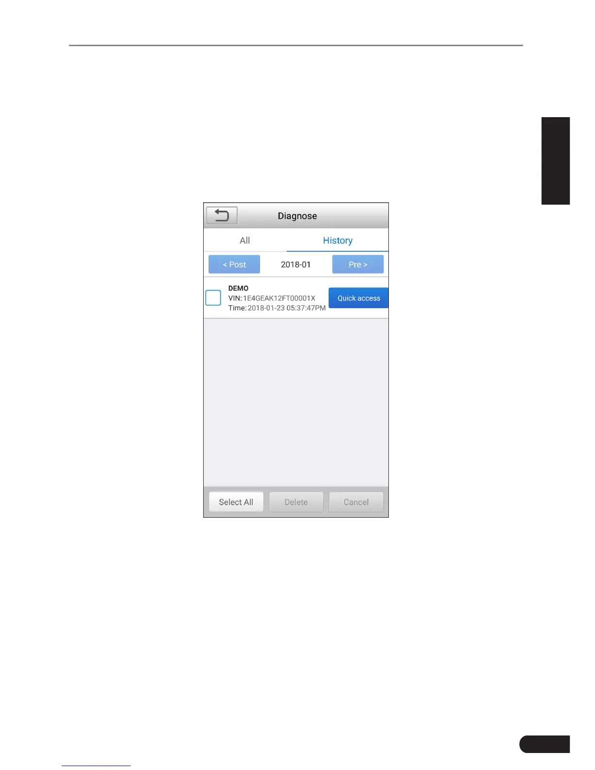Tap “History” on the Manual Diagnosis main menu screen, all diagnostic records