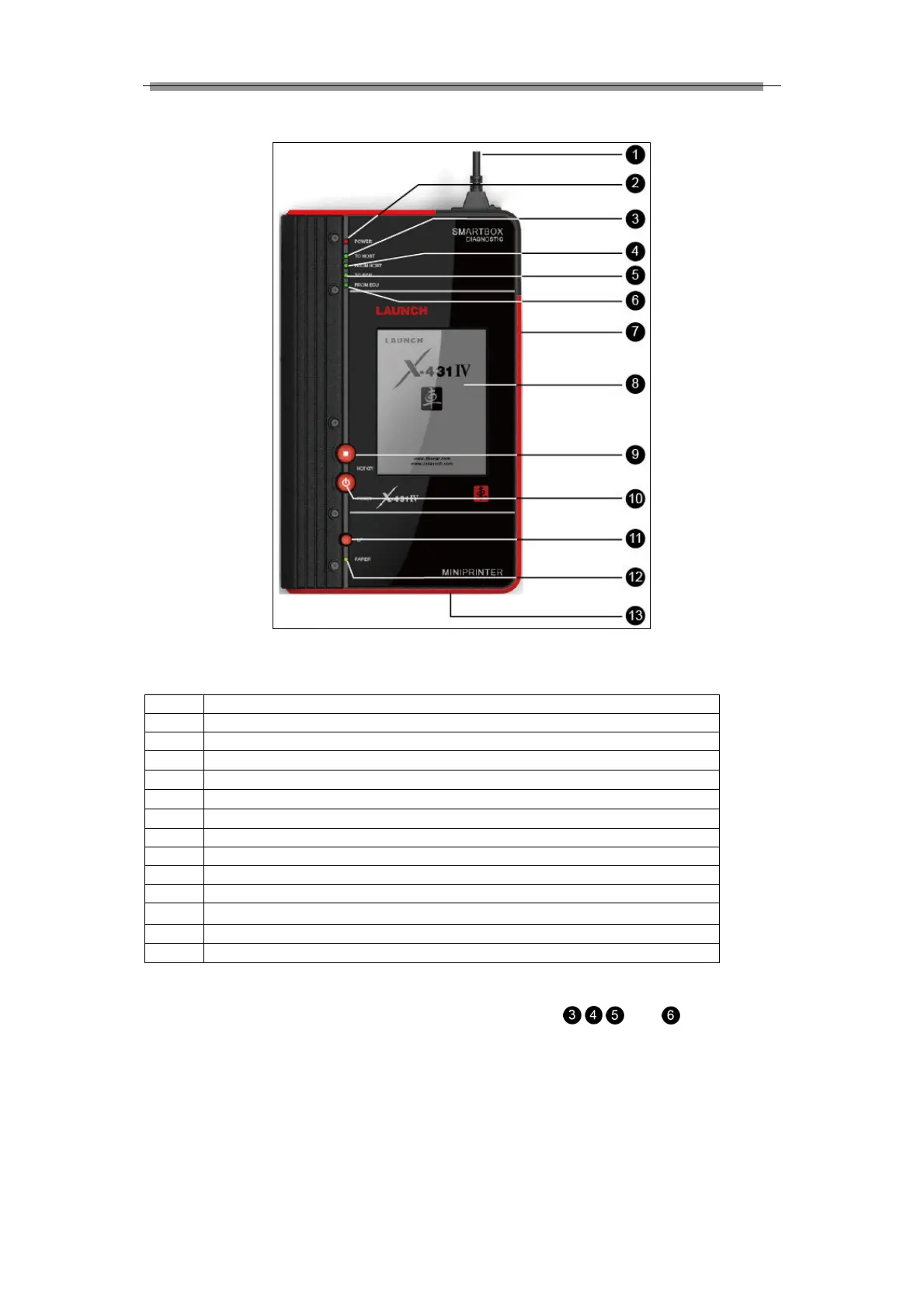 Table 2-1 formulates all keys, ports and indicators of X-431IV front panel.