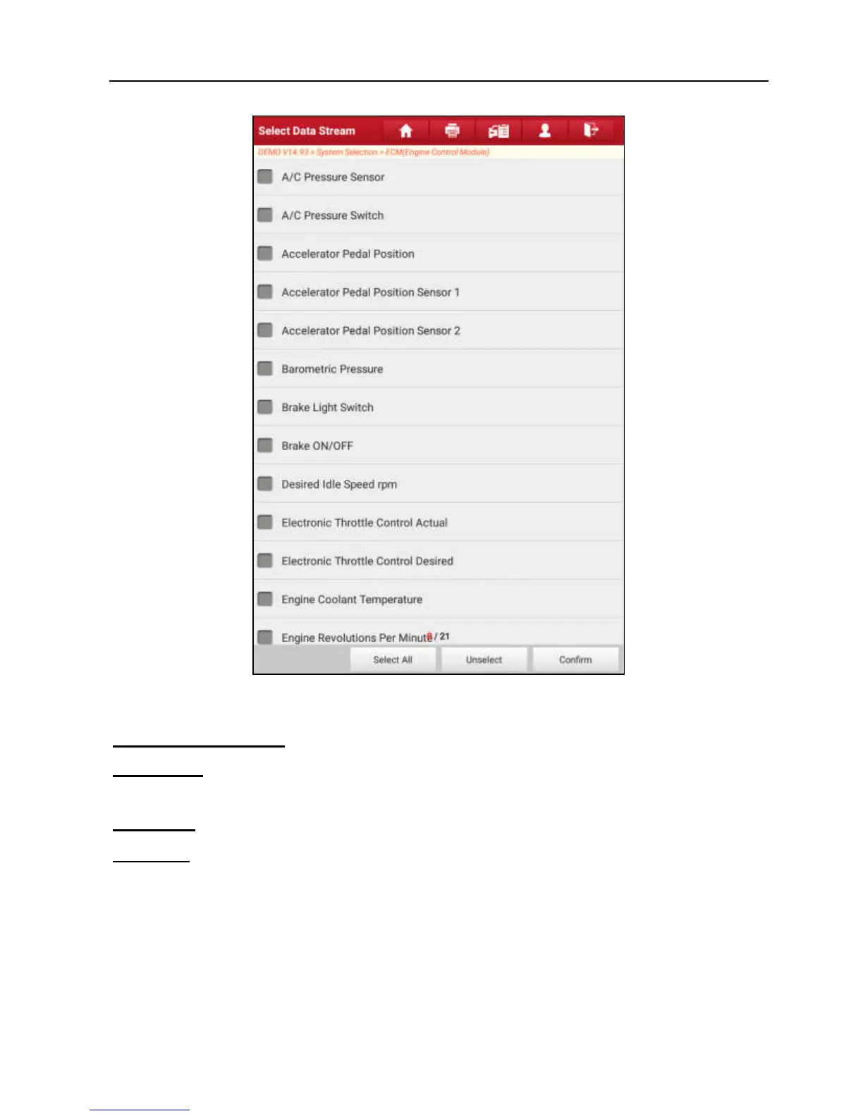 After selecting the desired items, tap “Confirm” to enter the data stream reading