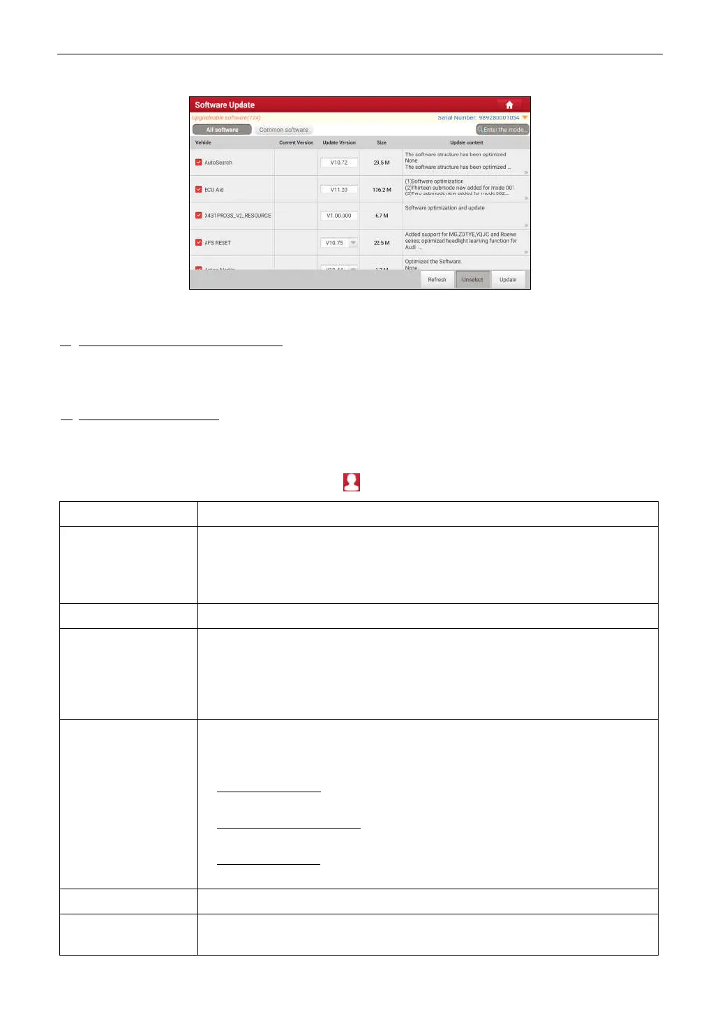 Software Update To update vehicle diagnostic software and APK.