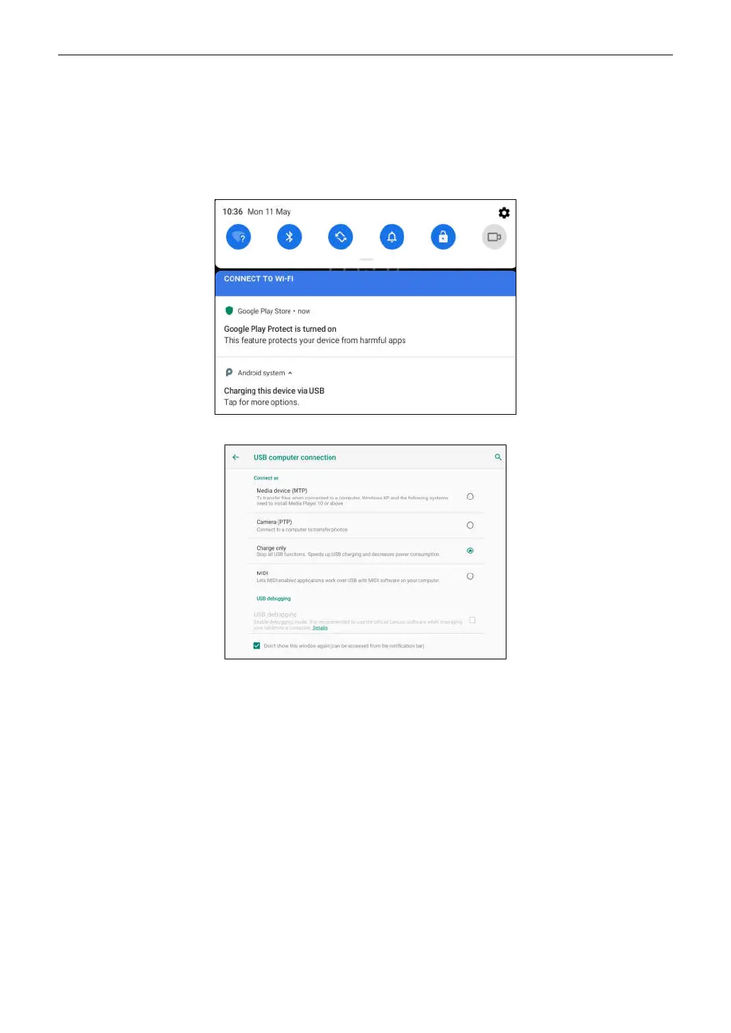 3. Tap Charging this device via USB, the following setting options will be displayed on the screen.