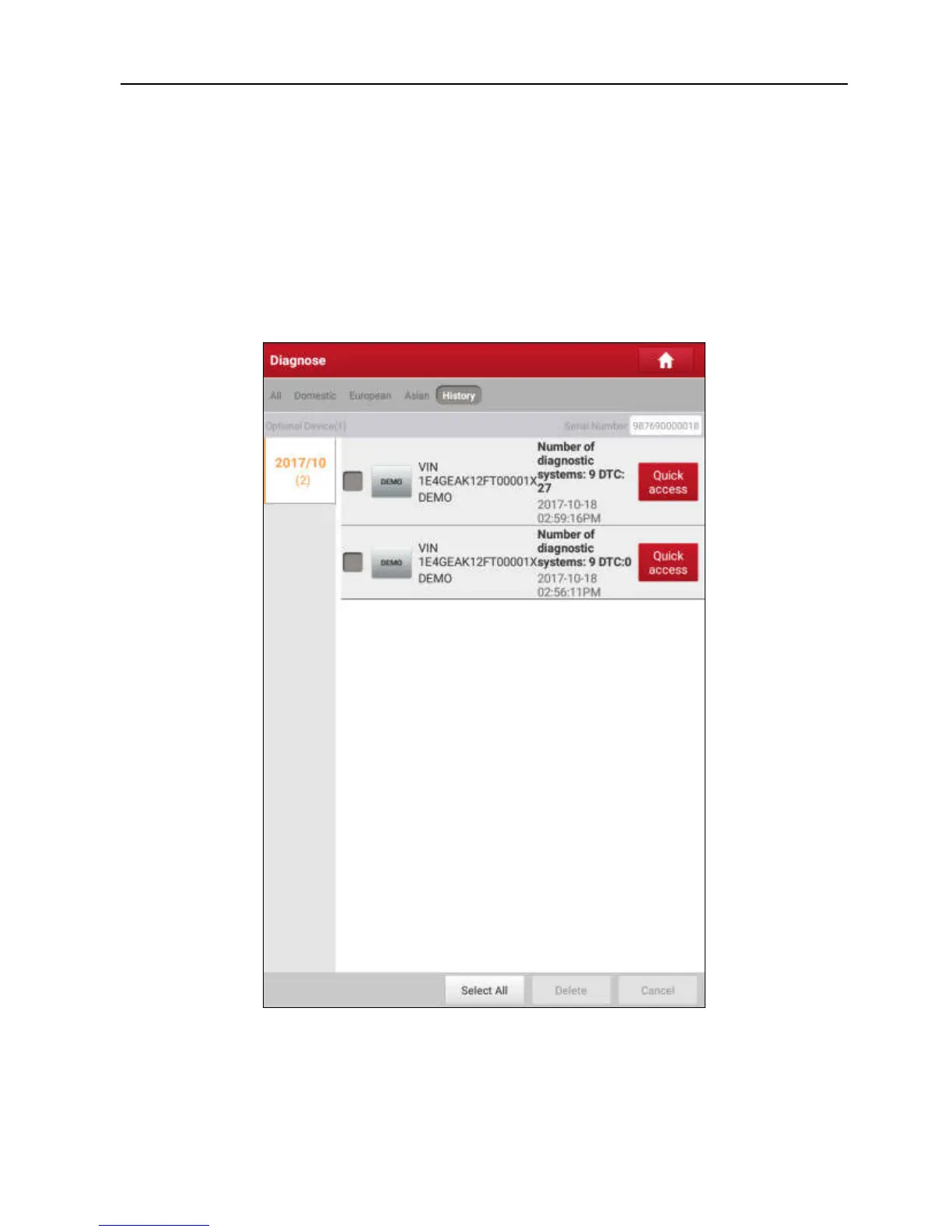 Tap “History” on the Diagnose main menu screen, all diagnostic records will be