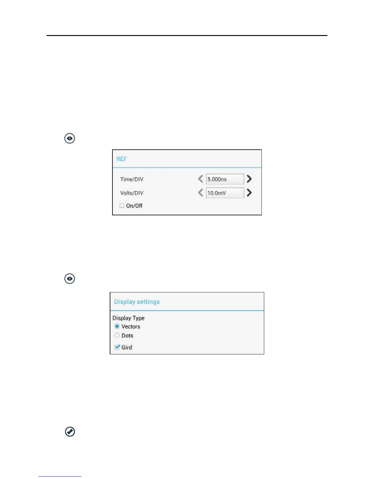 Tap < or > to select the desired reference value for time/DIV and volts/DIV. To