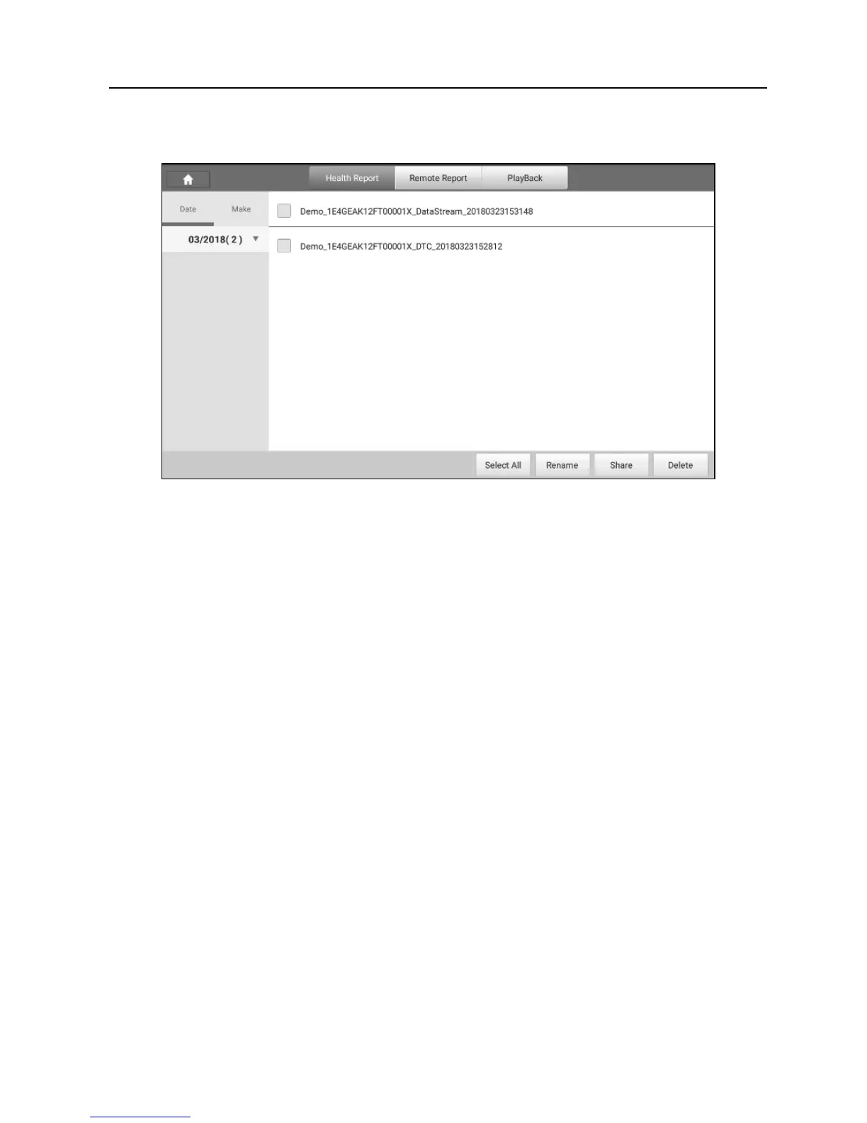 All the diagnostic reports are sorted by Date and Make. Tap the desired type to