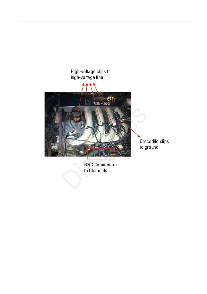 the high-voltage clip to high-voltage line, and crocodile clips to ground.