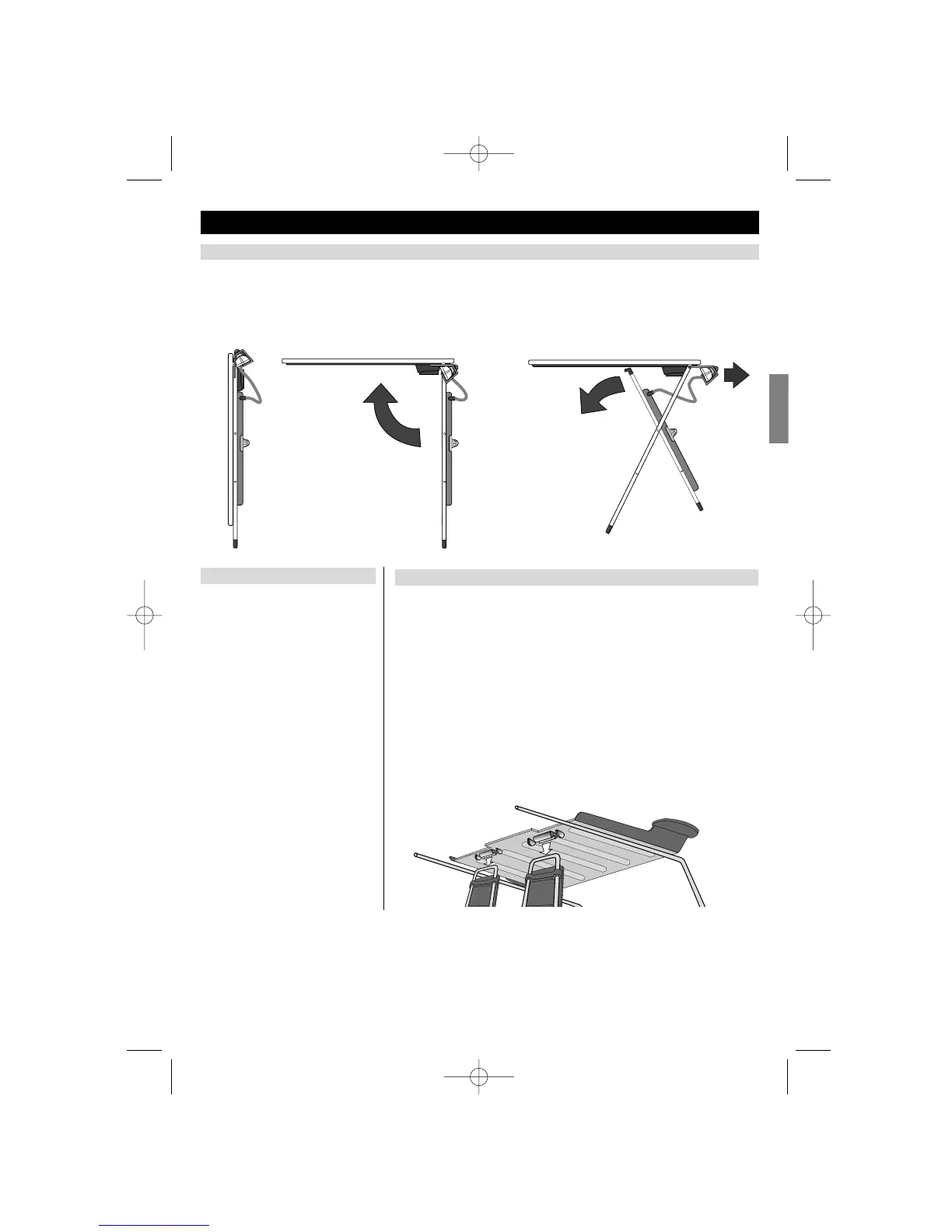 1. Place the board vertically on the ground. 2. Lift the table top and hold it in one hand. 3. With the other