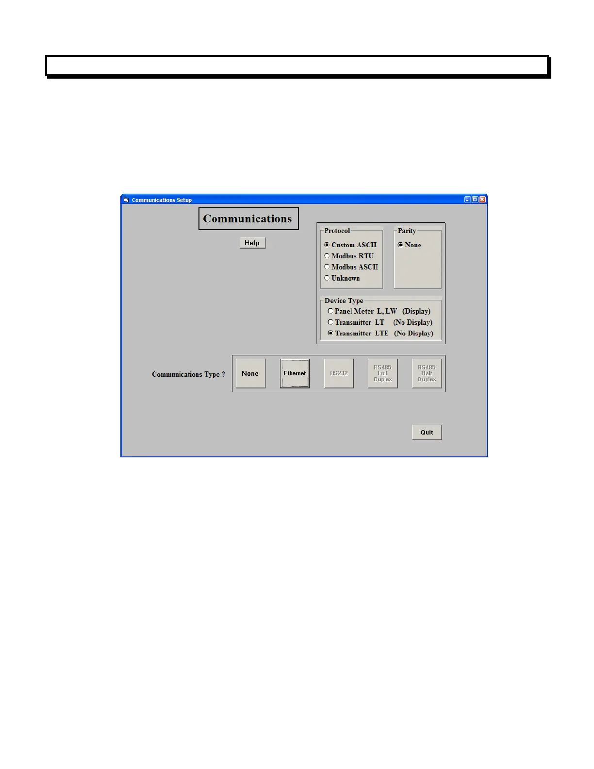 In the Communications Setup screen, select Transmitter LTE as the Device Type, Ethernet as