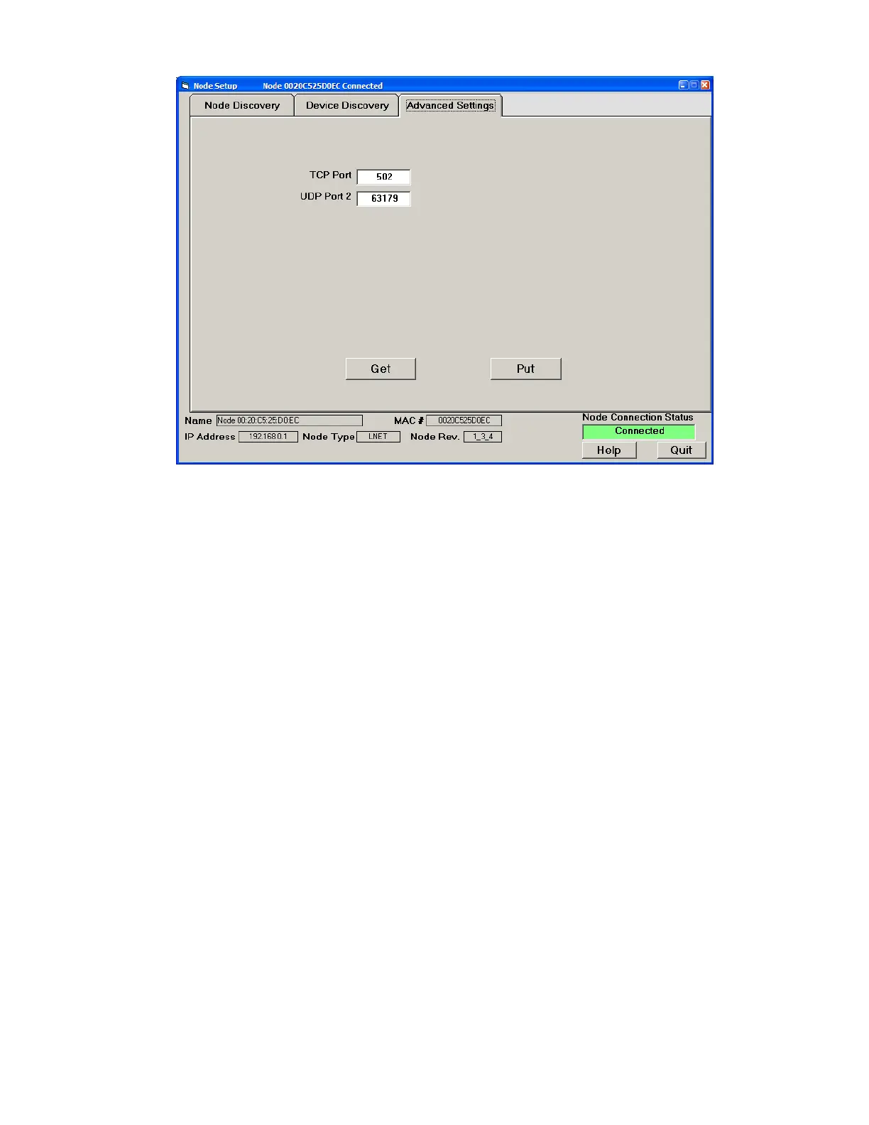 TCP and UDP Port settings. Press Get to retrieve settings from the Node to the PC. Press Put to