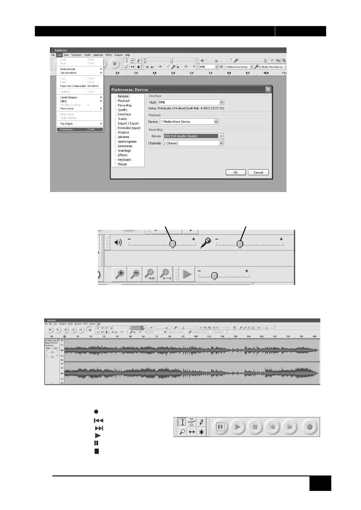 6. Use the Audacity control panel to record or listen the music you have recorded