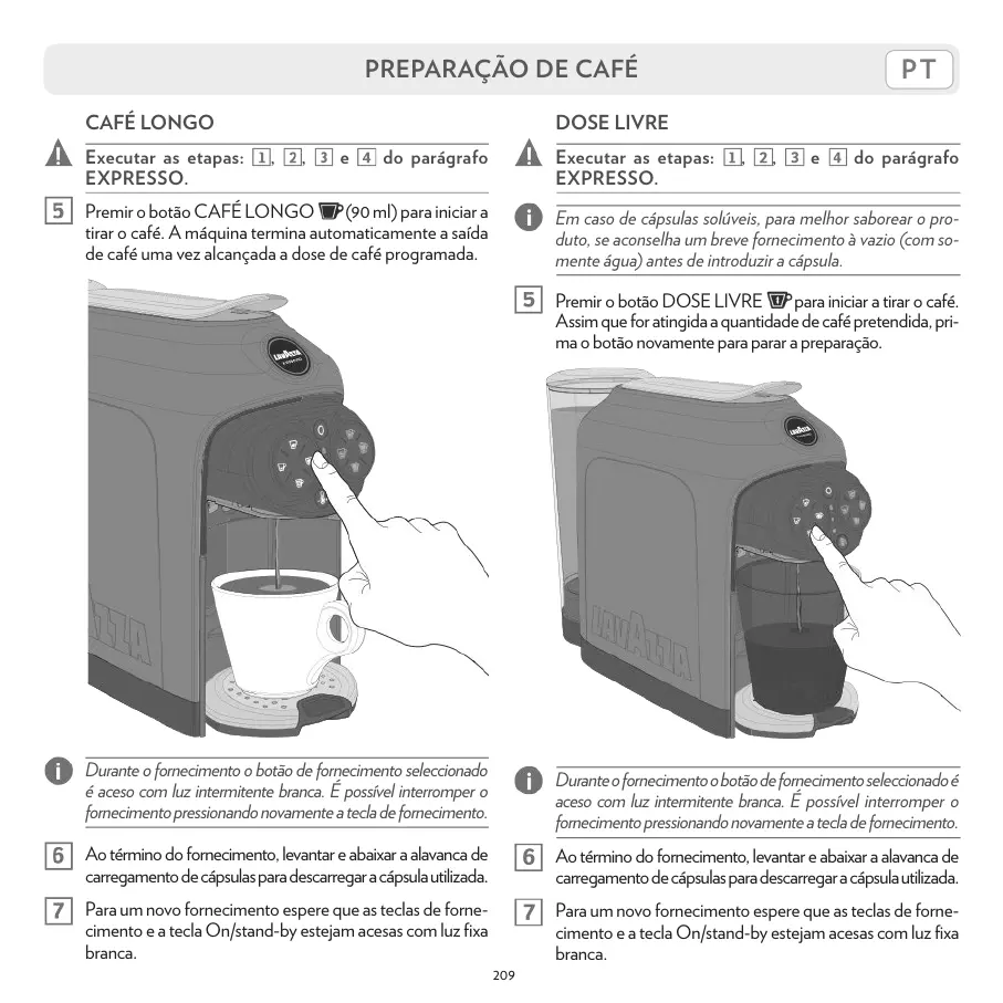Premir o botão CAFÉ LONGO (90 ml) para iniciar a