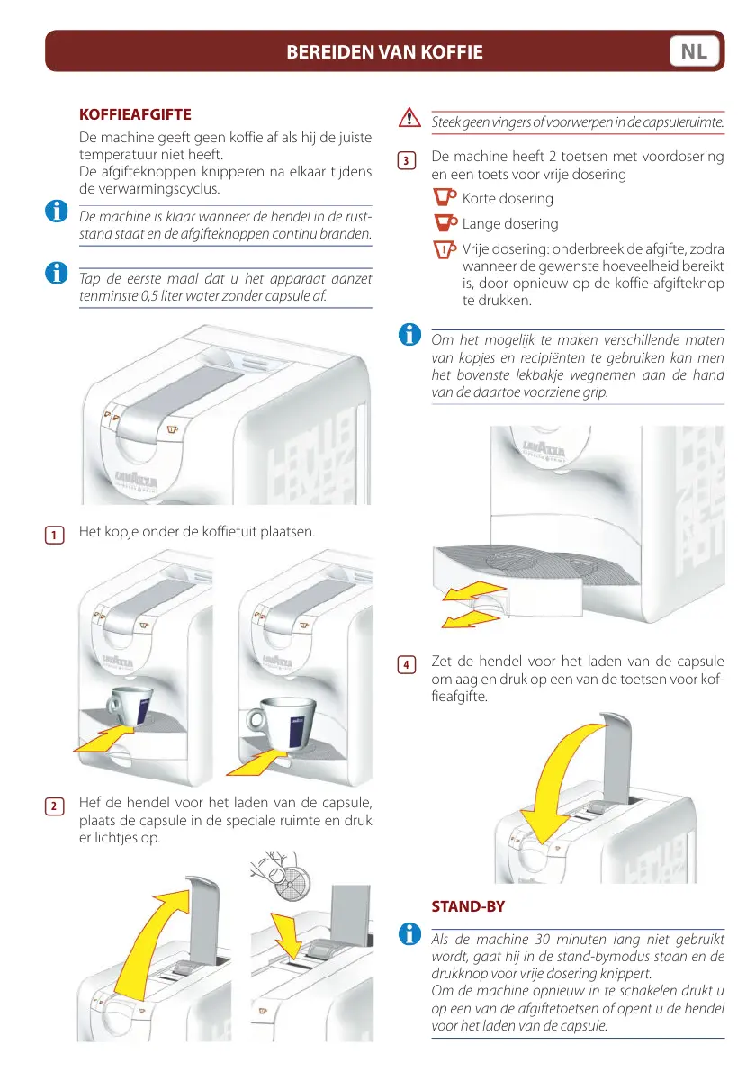 Steek geen vingers of voorwerpen in de capsuleruimte.