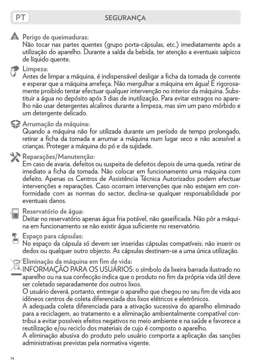 Não tocar nas partes quentes (grupo porta-cápsulas, etc.) imediatamente após a