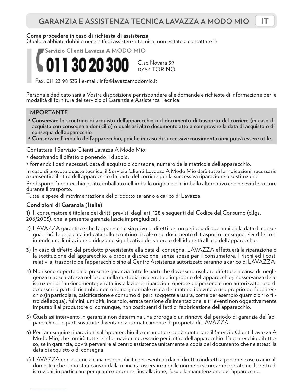 6) Per far eseguire riparazioni sull’apparecchio il consumatore potrà contattare il Servizio Clienti Lavazza A