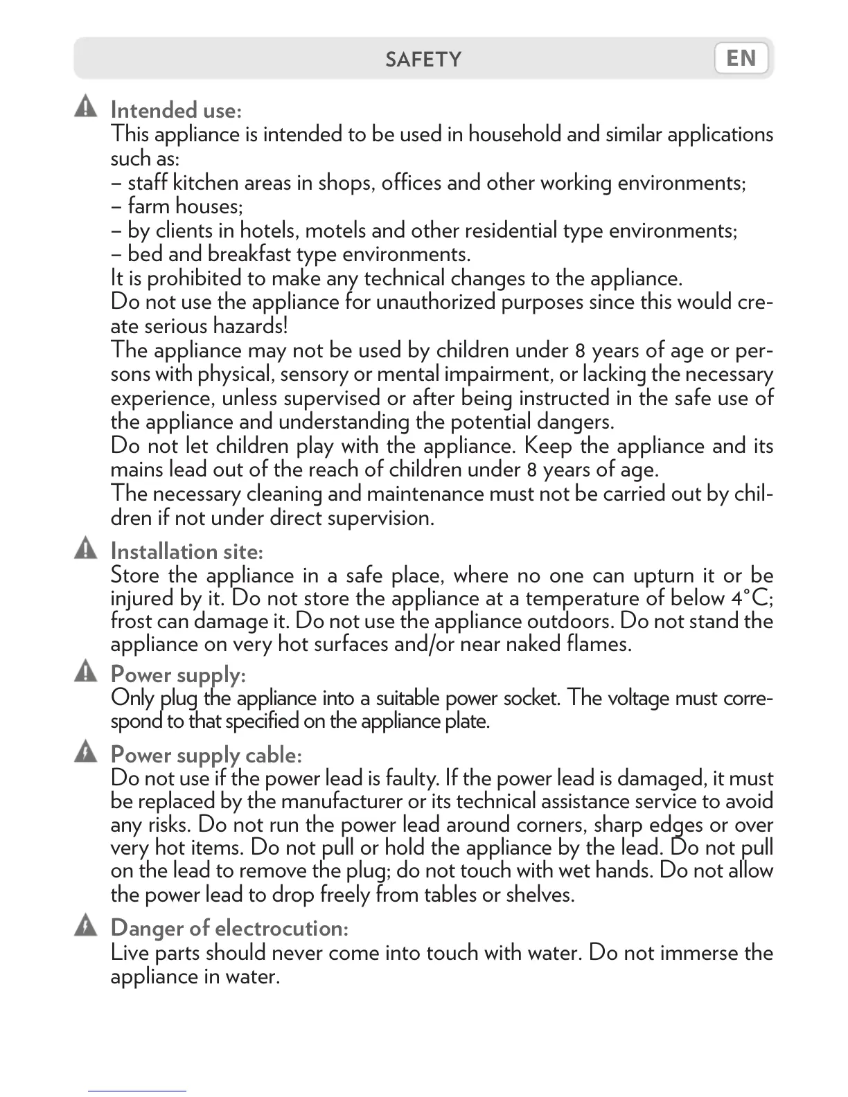 injured by it. Do not store the appliance at a temperature of below 4°C;