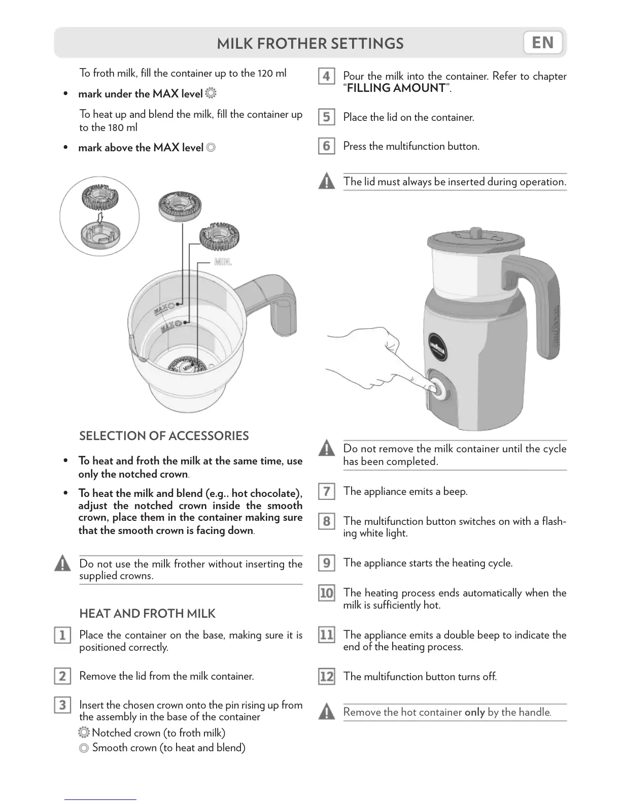 • To heat and froth the milk at the same time, use