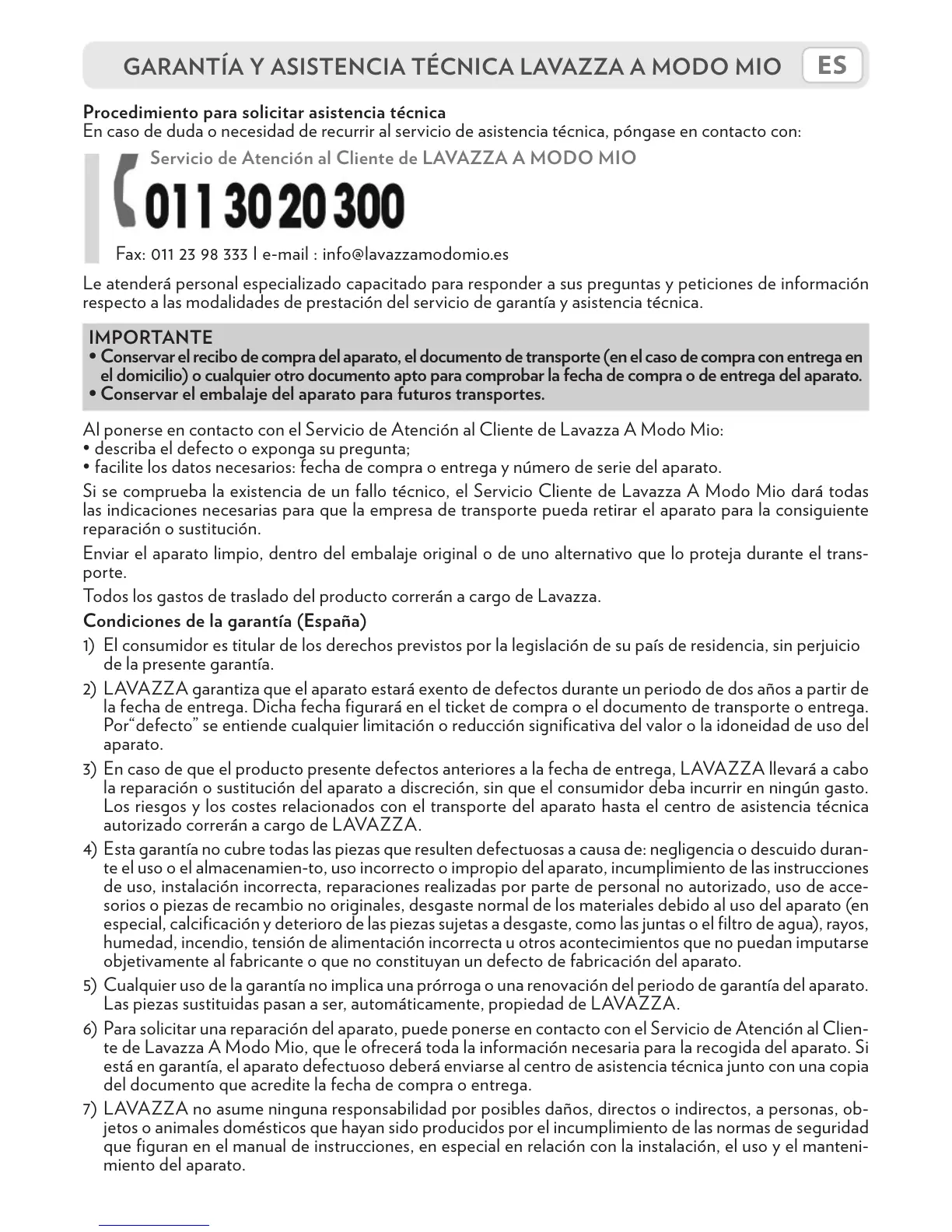 2) LAVAZZA garantiza que el aparato estará exento de defectos durante un periodo de dos años a partir de
