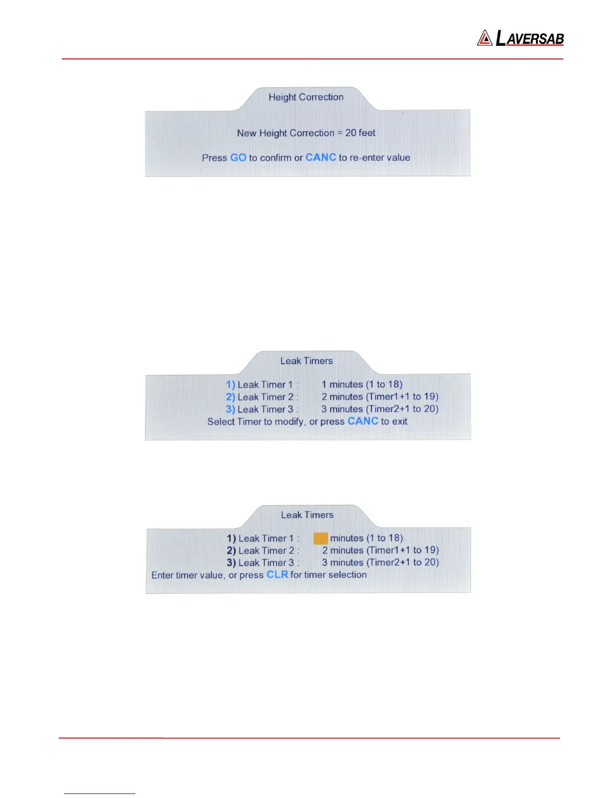 To check or modify the Leak timers used in the Leak mode, select ‘7’ on the Functions menu. The screen