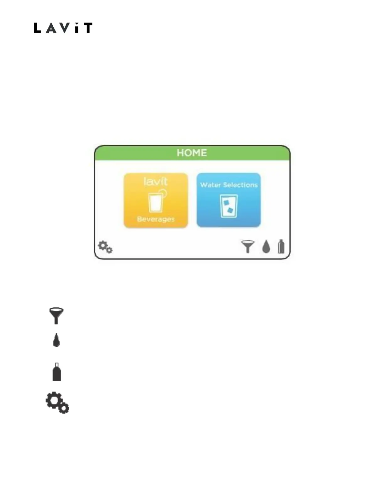 of still and sparking water. The HOME screen may also have up to four icons displayed: