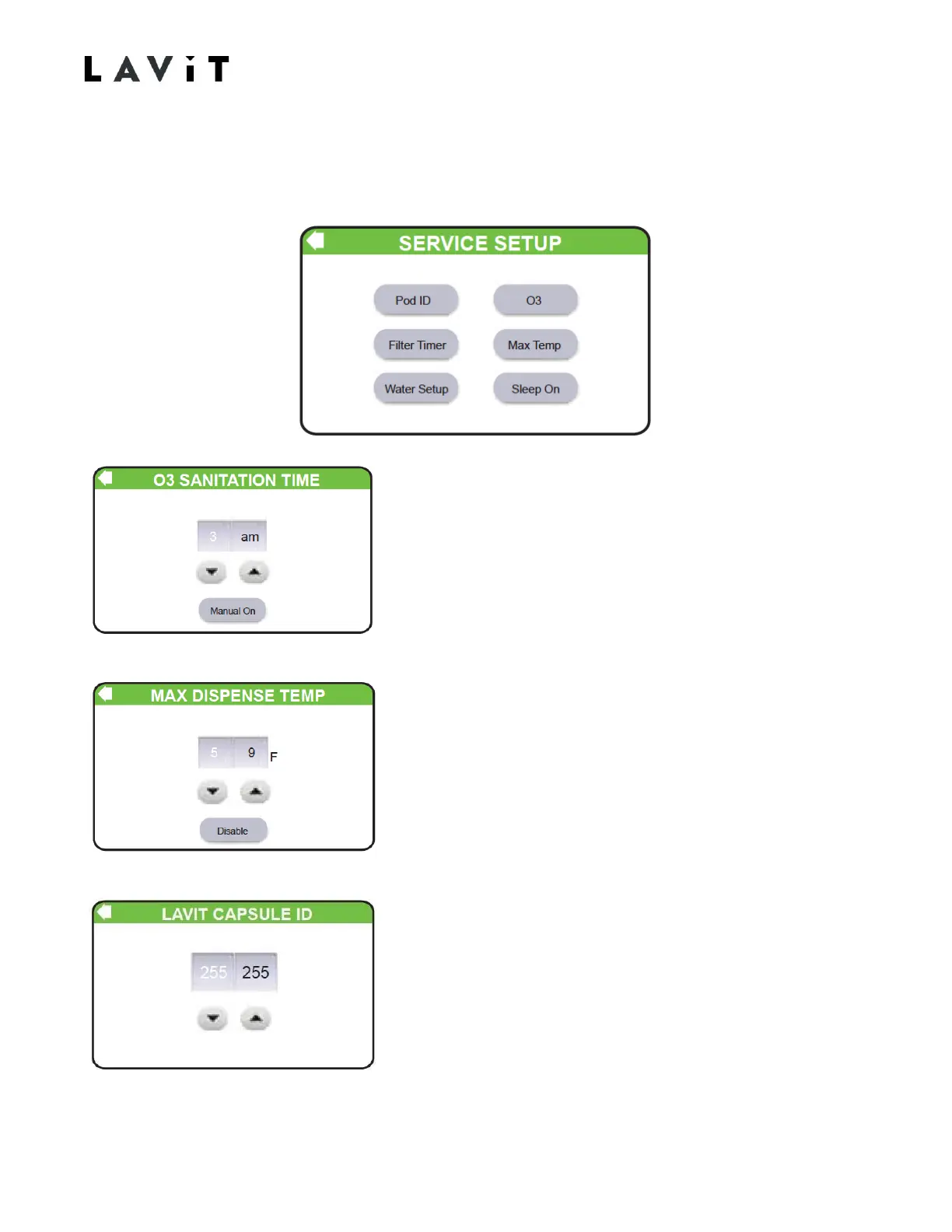 The SERVICE SETUP SCREEN is displayed when the correct password is entered. There are six (6)