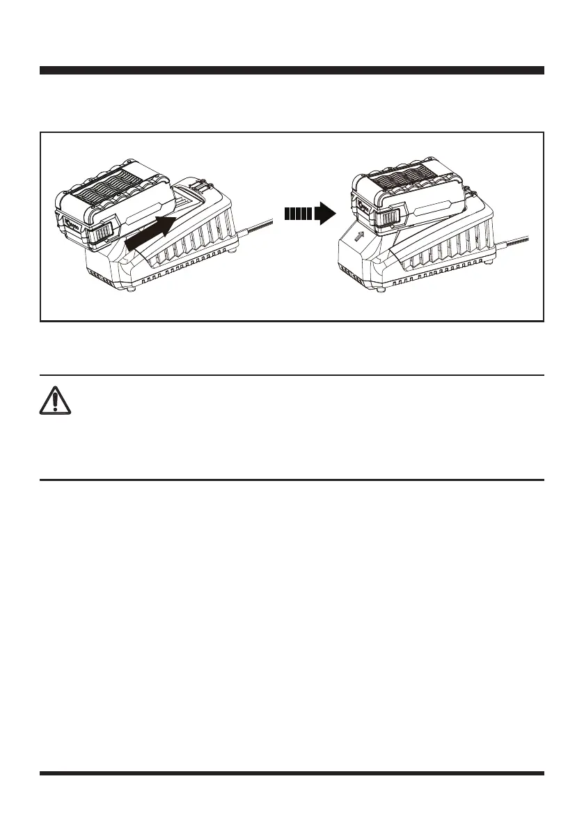 1. Align the slot of the battery pack with the rail on the charger. Slide the battery onto the rail until the