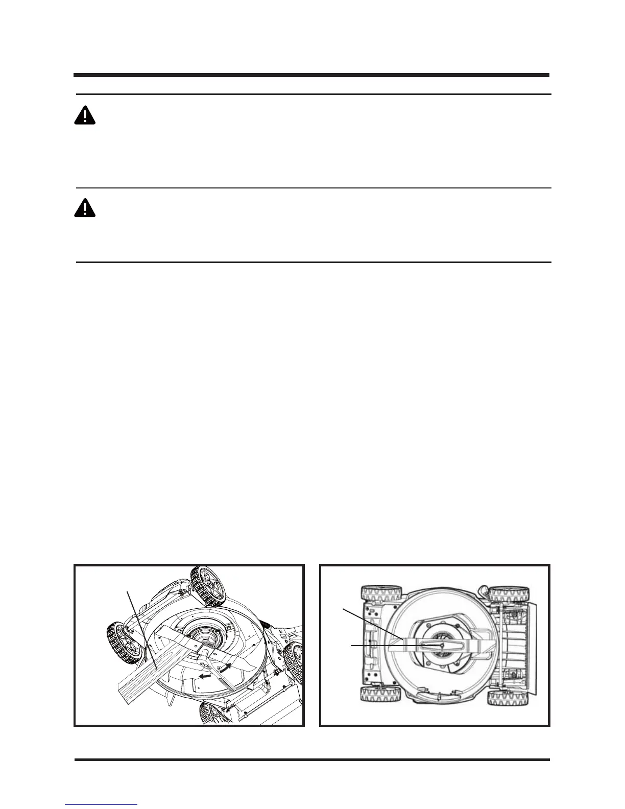 ŶWedge a block of wood between the blade and the mower deck in order to prevent the blade