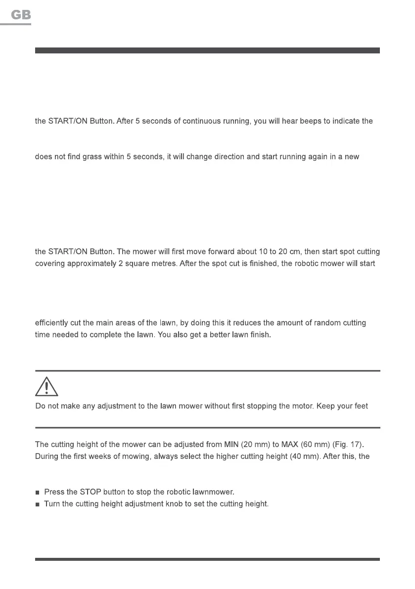 The robotic lawnmower will automatically search for a suitable working area. If the robotic mower