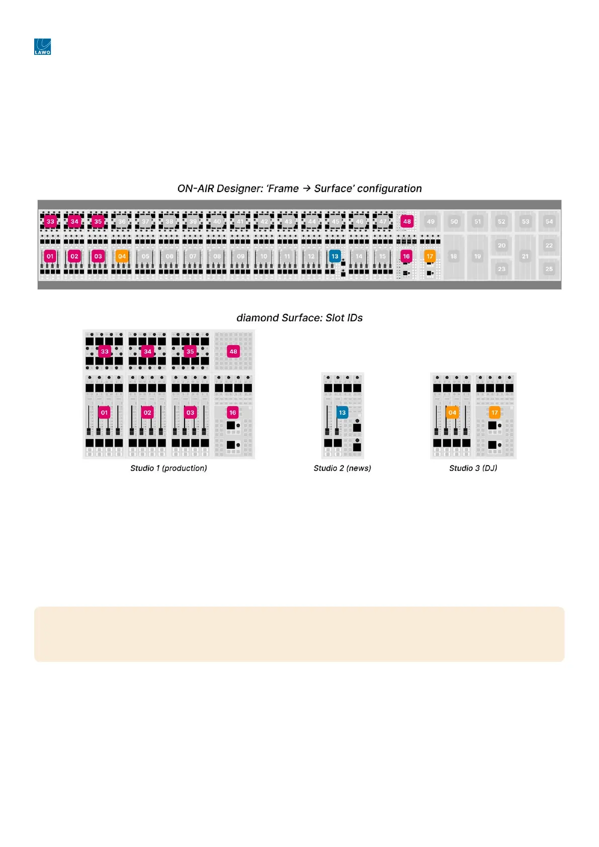 In our example, the studio 1 console controls faders 1 to 24, in two layers, (via IDs 1 to 3) and belongs to Access Group 1