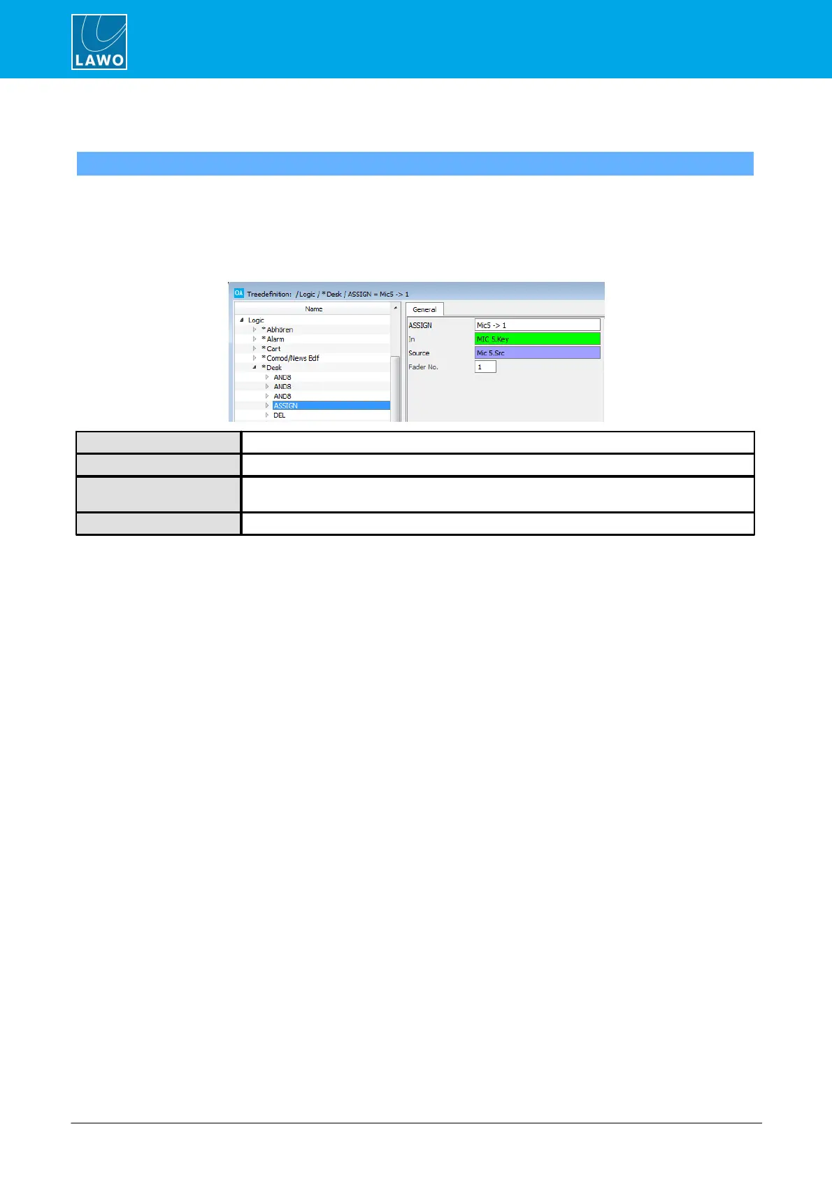 An ASSIGN element can be used to assign a source to a fader strip under the control of a logical signal such