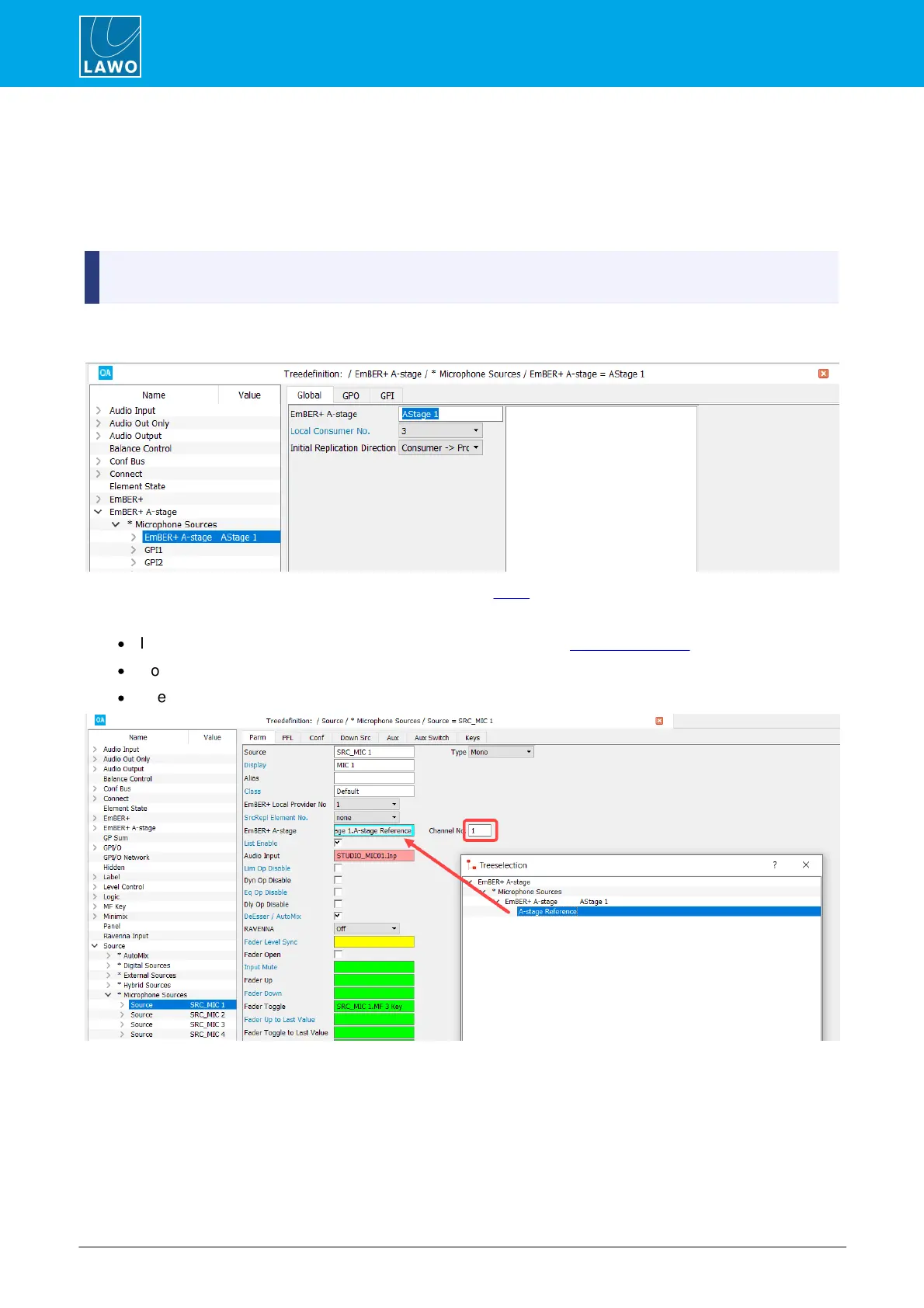 An Ember+ A-stage element allows microphone and GPIO parameters within an A__stage device to be