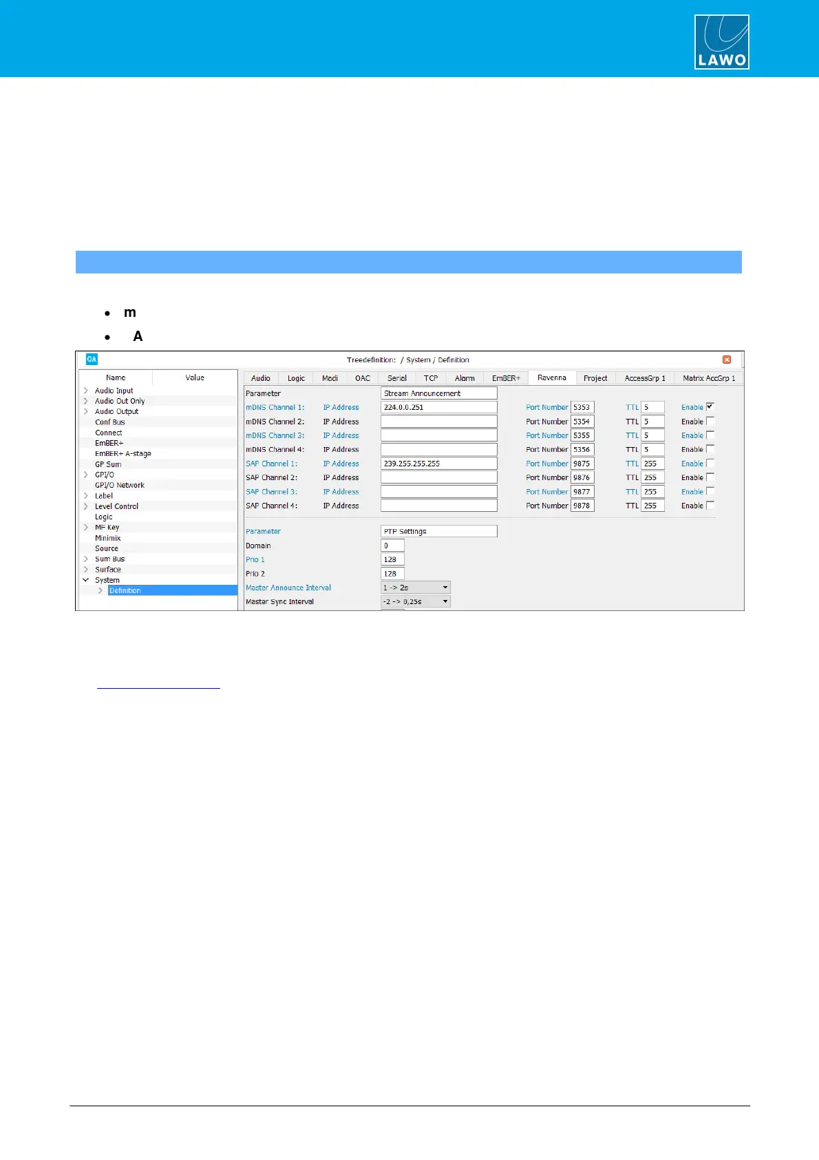 Start by selecting "System -> Definition" in 'Tree Definition' and the Ravenna tab. Scroll down to access the