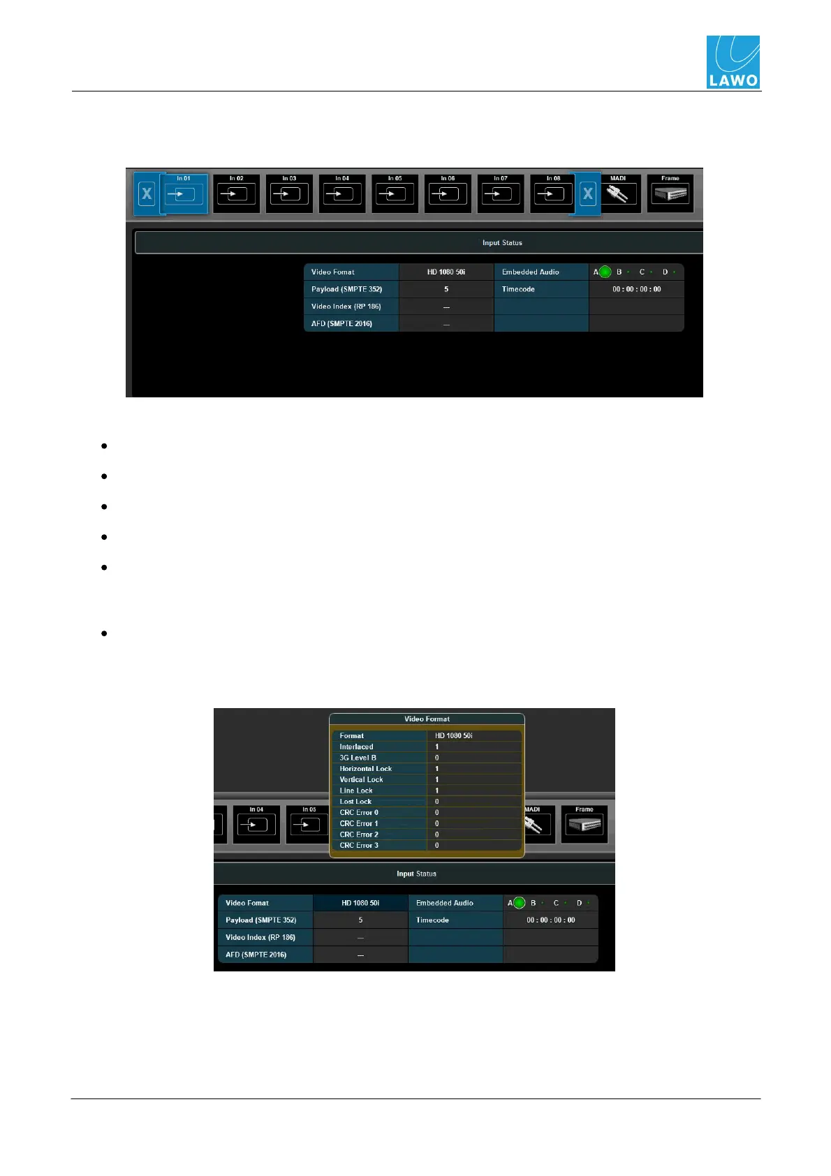 1. Select Status -> SDI In, and then select an input (In01 to In08) from the sub menus:
