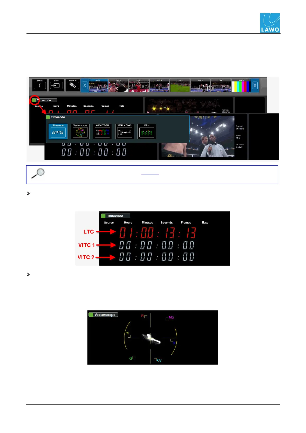 Displays the three embedded timecode streams (VITC 1, VITC 2 and LTC):