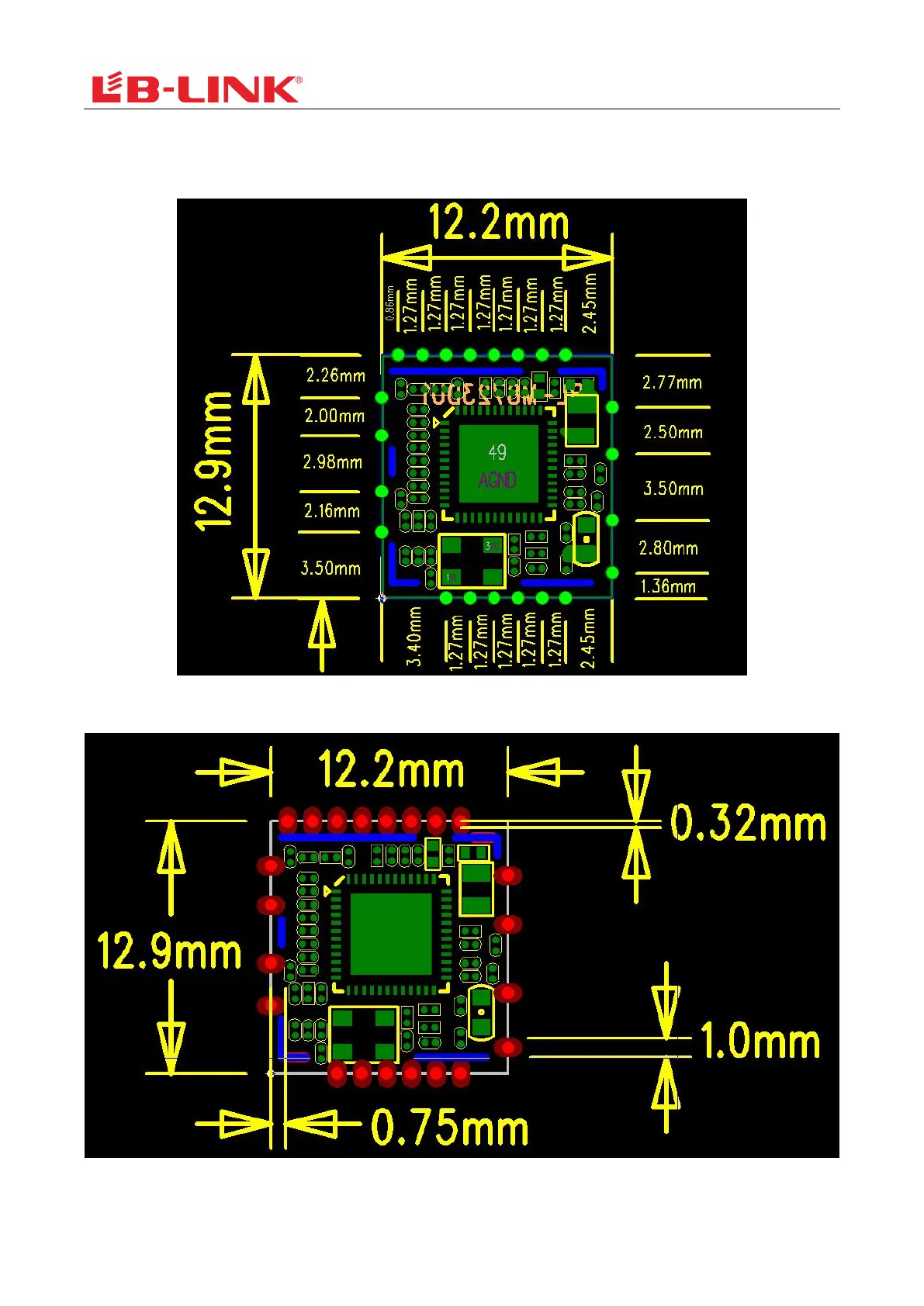 PCB Module dimension: Typical ( L*W * H): 12.2mm*12.9mm*0.8mm Tolerance : +/-0.15mm