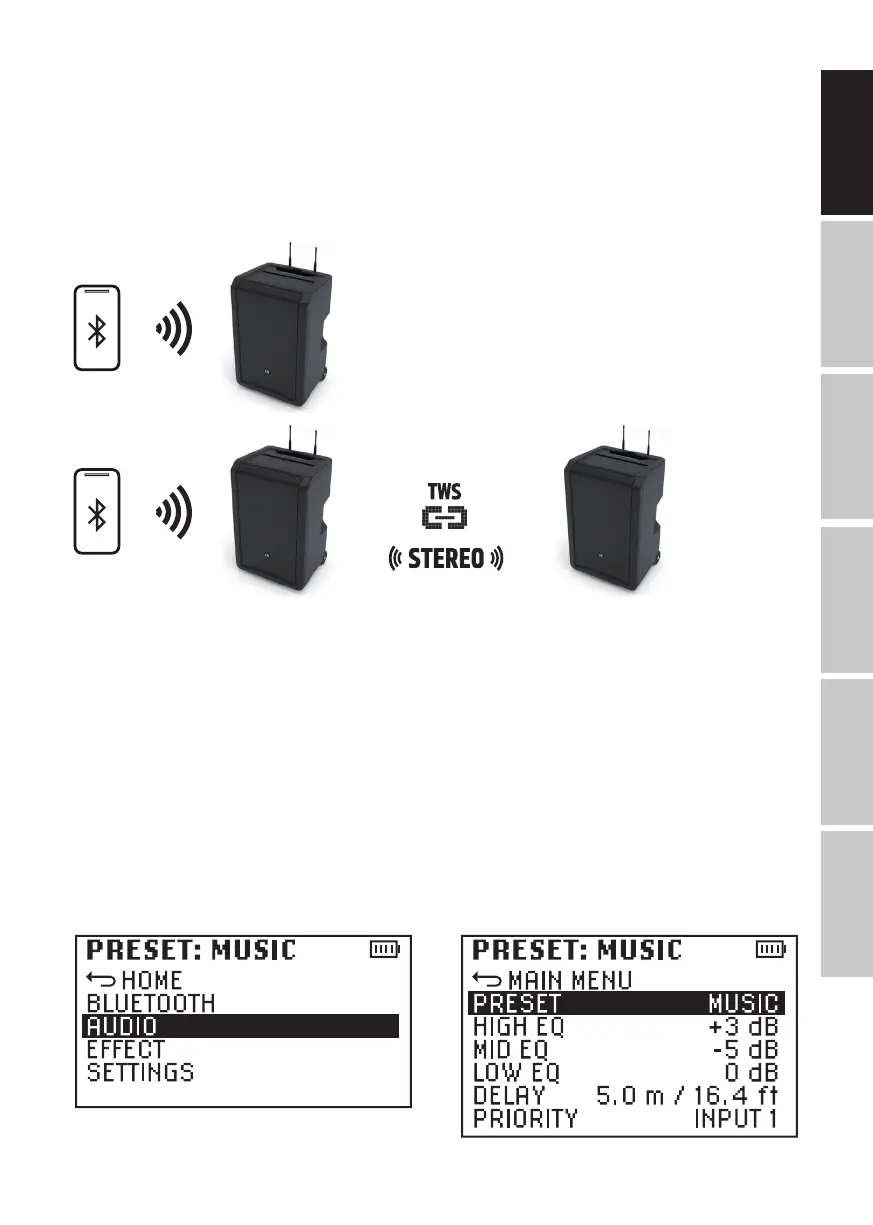 without having to connect both speakers by cable. To connect via TWS, simply activate TWS in both units